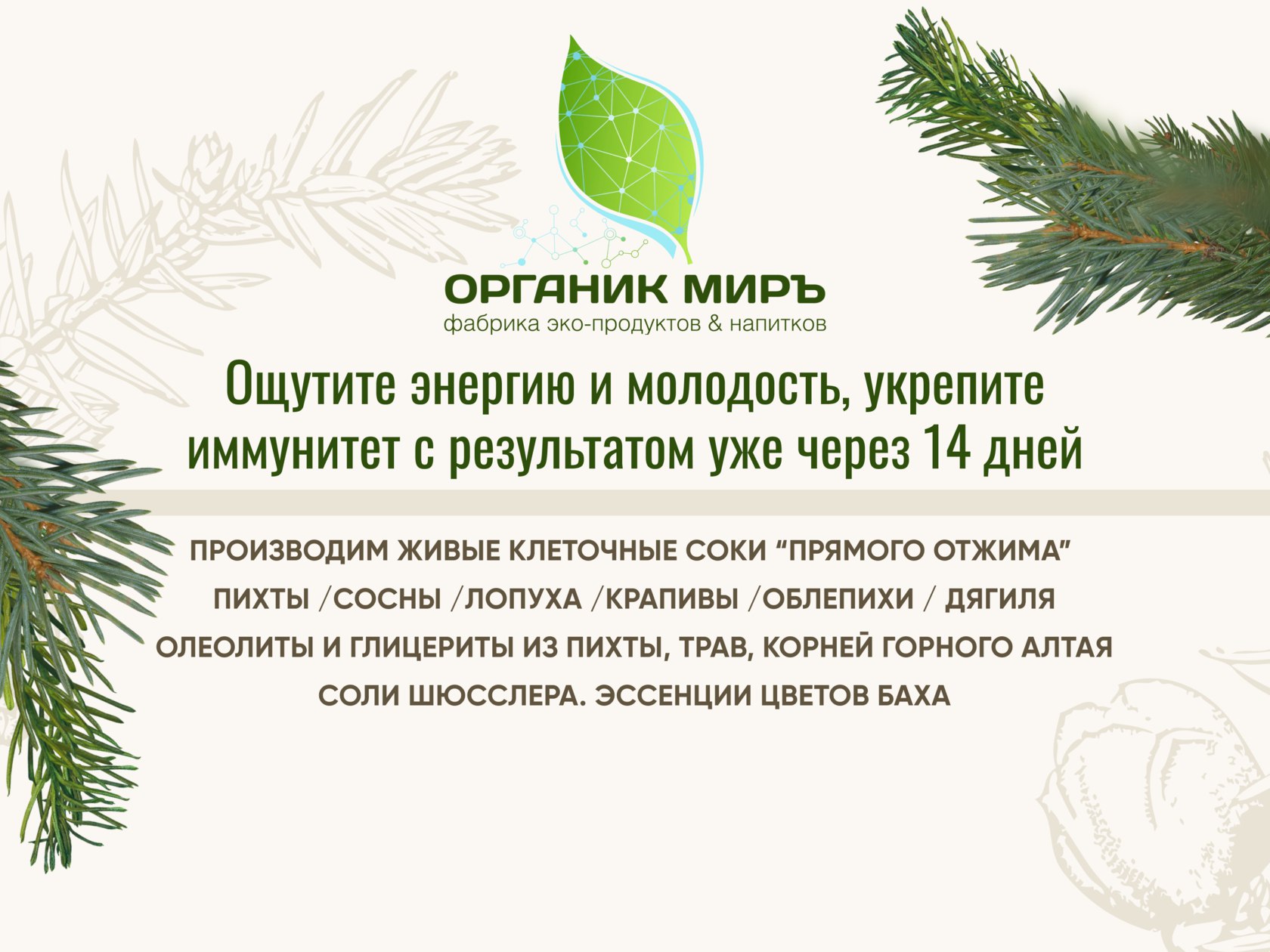 Живые соки органикМИРЪ сделаны по технологии прямого отжима и ферментирования. В их составе: корни и листья растений (лопуха, одуванчика, крапивы, подорожника). Объем — от 100 мл. Производство прямо в Горном Алтае.